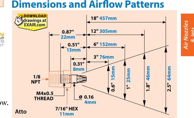EXAIR's Atto Super Air Nozzle delivers the smallest, most precise blowoff available. The air pattern for this tiny nozzle is highly focused, measuring just 1.0" in diameter when positioned 6" away from the surface. At only 58 dBA, the noise level is a fraction of ordinary air nozzles - perfect for quiet work environments. Using the Coanda effect, it amplifies airflow up to 25 times compressed air consumption while meeting all OSHA safety requirements. The PEEK material option is chosen for non-marring quality on sensitive lenses and optics.